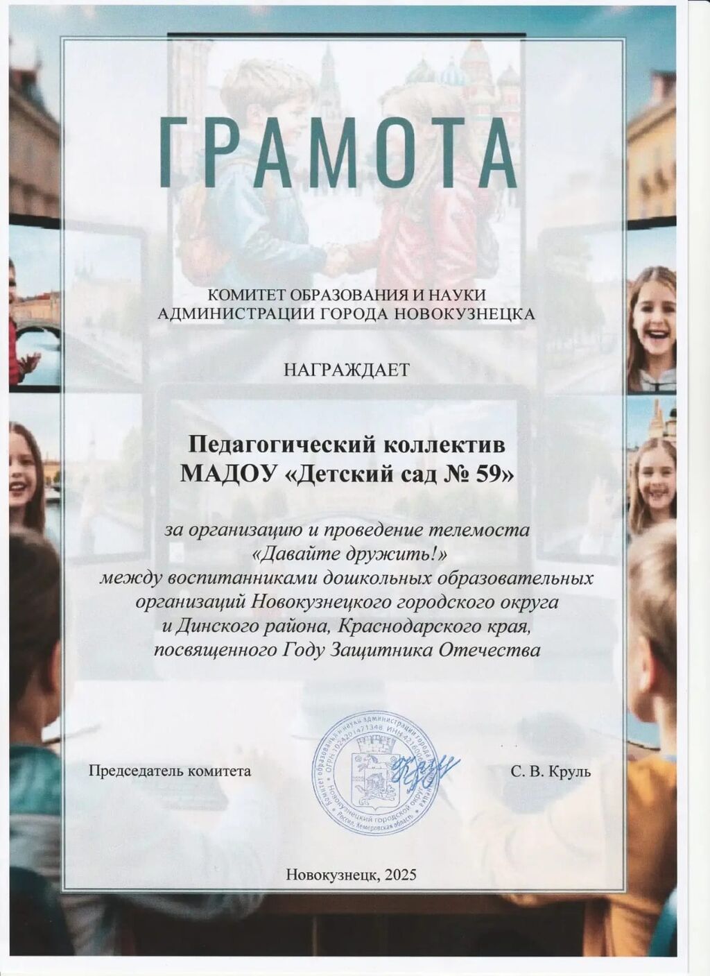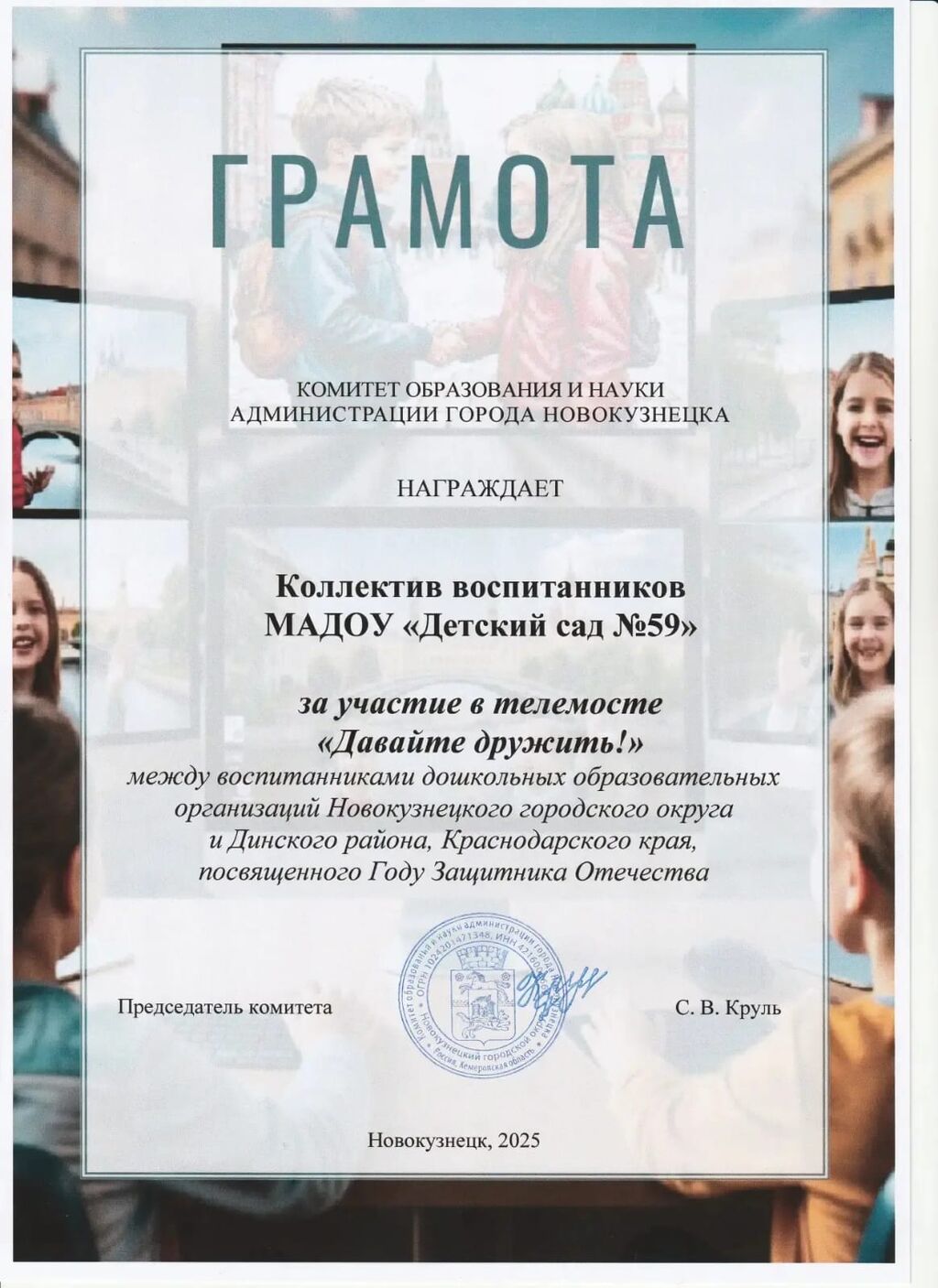 Между воспитанниками дошкольных образовательных организаций Новокузнецкого городского округа и Динского района Краснодарского края прошел телемост «Давайте дружить»», посвященный Году Защитника Отчества.